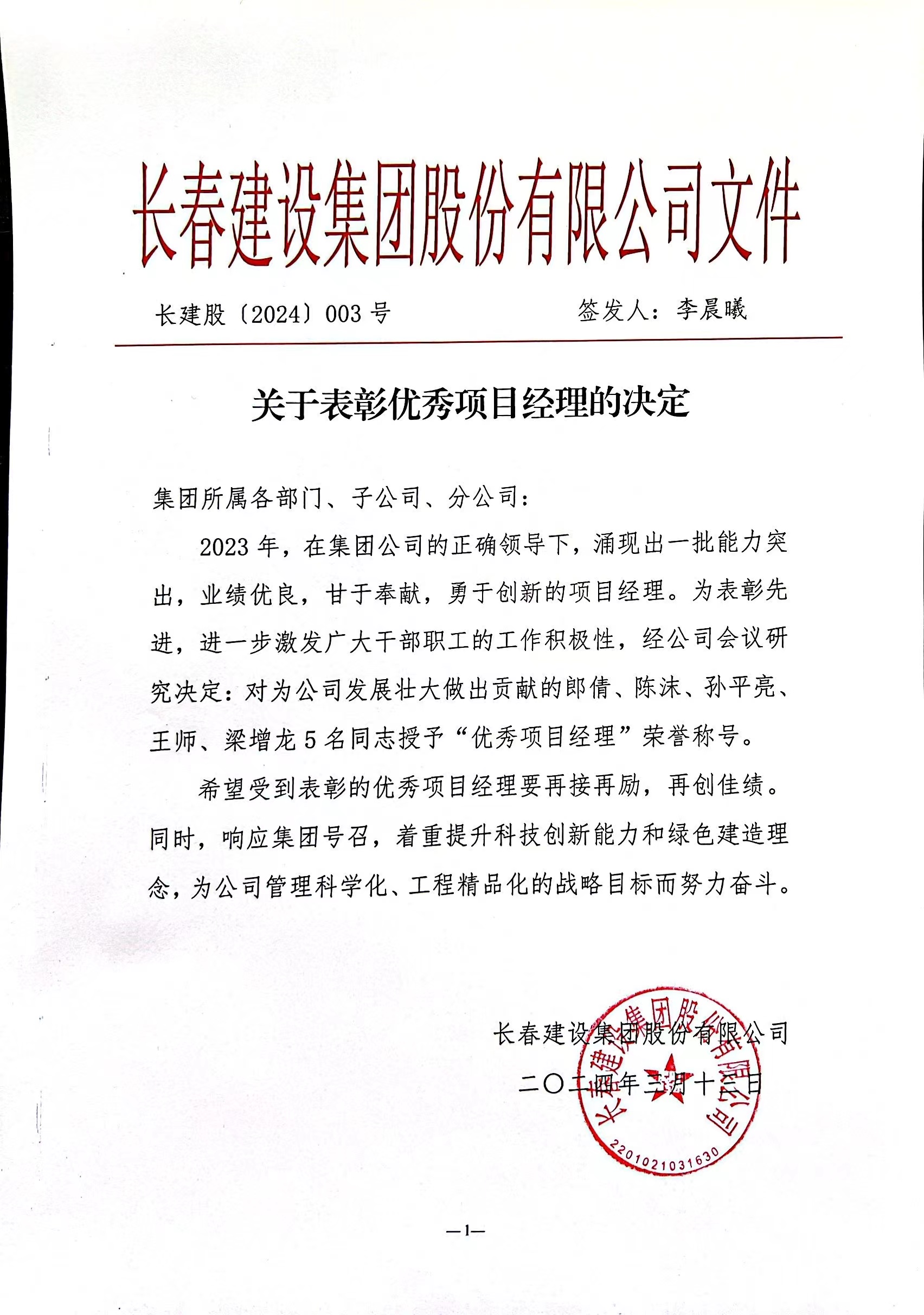关于表彰二〇二二年度“优秀项目经理”荣誉称号的决定