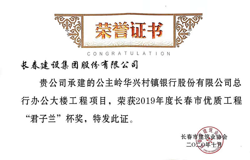 公主岭华兴村镇银行办公大楼工程项目荣获2019年度长春市优质工程...
